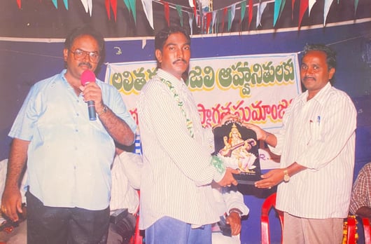 He received the "Guru Dronacharya" award from the New Delhi-based Avantika Art Association for his creative efforts in the year 2000. Similarly, in 2003, Lalitkalanjali-Guntur awarded him with the "CHITRAKALACHARYA VARYA," and SRI POTTI SRIRAMULU LALITHA KALA PARISHAD-ACHAMPET also facilitated him in 2005.